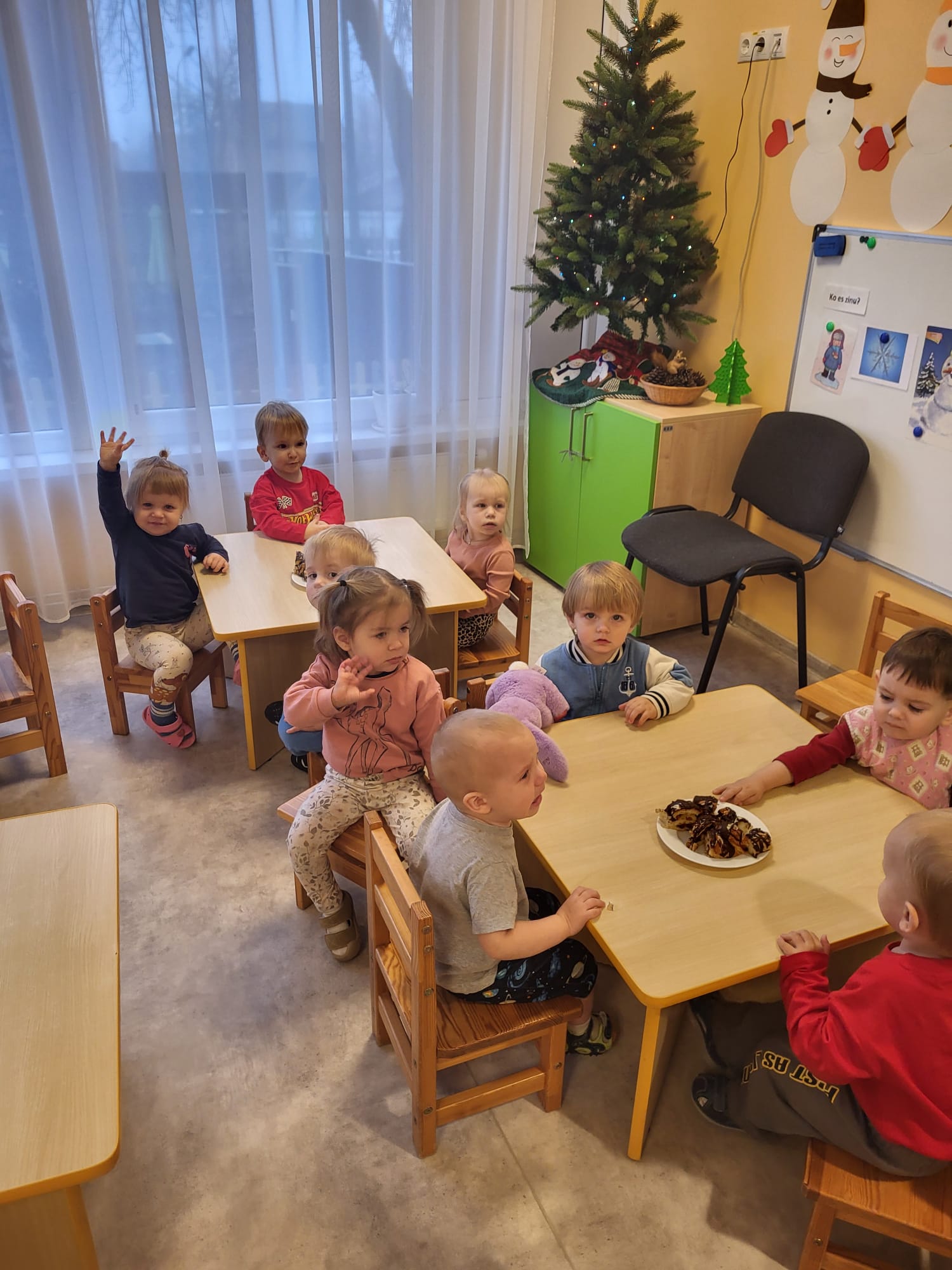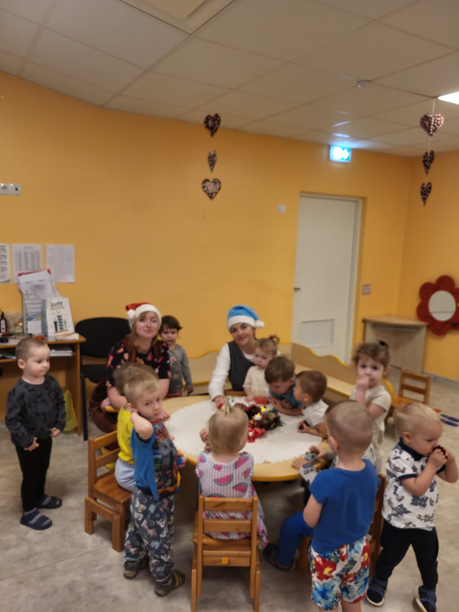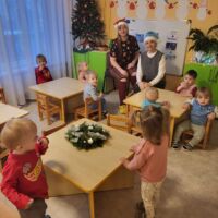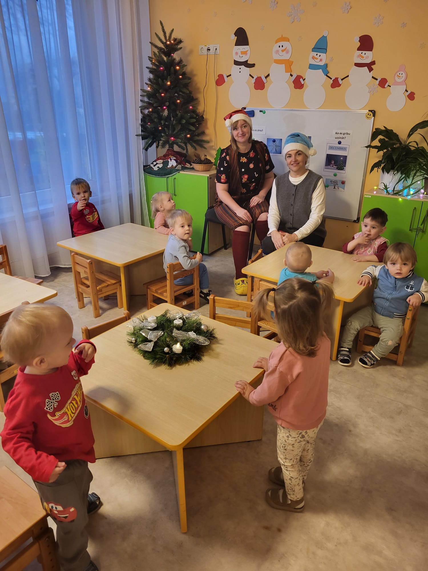 Šorīt divi rosīgie un čaklie rūķi nolēma apciemot katru no pirmsskolas iestādes grupām un iededzināt pirmās svecītes. Skanot Ziemassvētku melodijām, divi varoņi devās uz katru no grupām un apskatīja svētku vainagus. Tie bija ļoti dažādi, piemēram, Rūķu, Dabas materiālu, Gaismiņu un Eņģeļu vainagi, un pat vainags no ikdienā lietojamiem priekšmetiem. Visi vainagi bija ļoti skaisti, dažās grupās tika pamanīti arī adventes kalendāri, kur iekšā likti dažādi uzdevumi vai labie darbi katrai dienai.