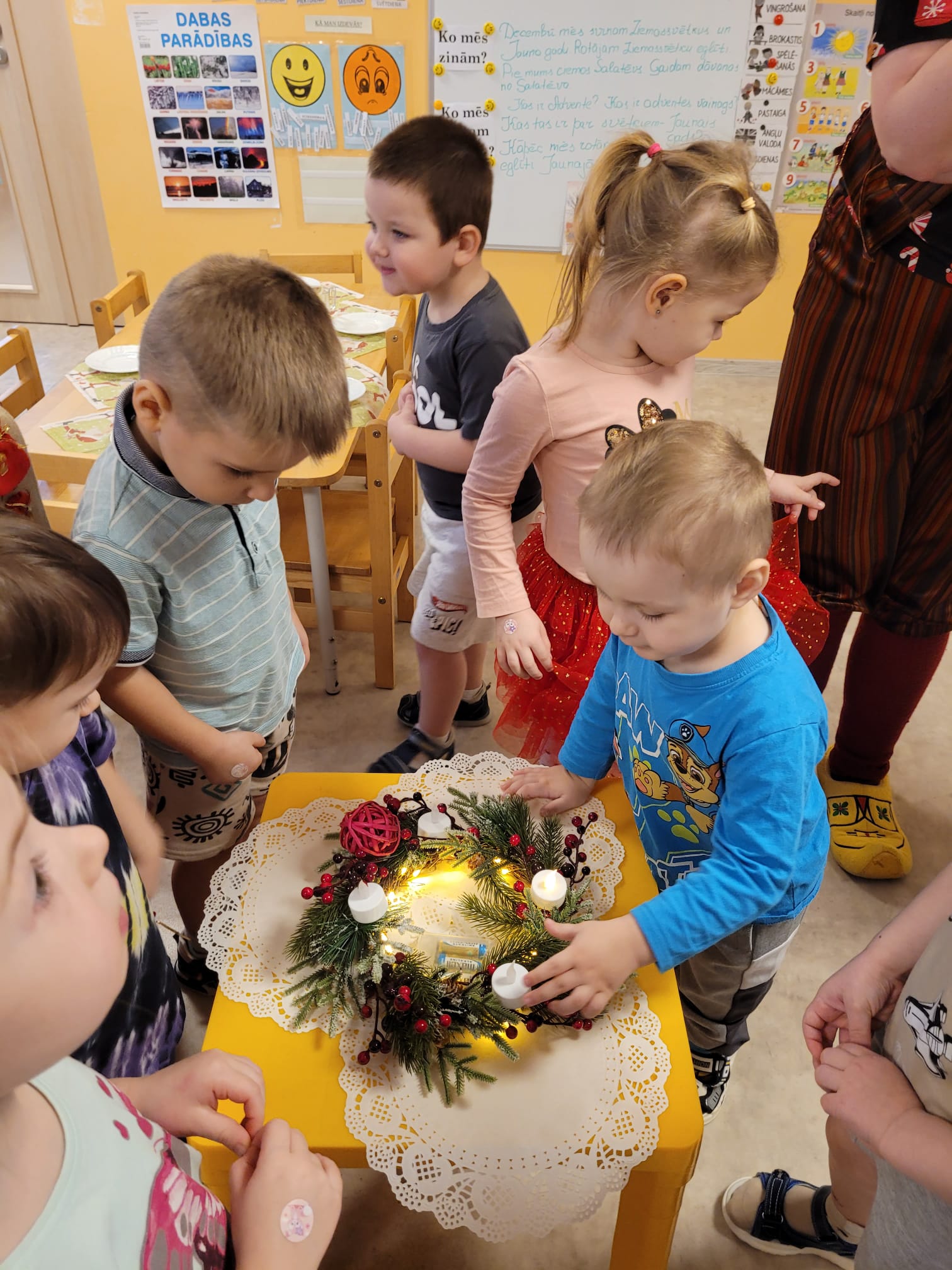 Jau baltais un pūkainais sniegs ir noklājis māju jumtus un klāt ir klusais Adventes laiks. Viens no neiztrūkstošajiem šī laika simboliem ir vainags ar četrām svecēm, kas simbolizē četras vērtības – prieku, cerību, mīlestību un mieru. Mūsu pirmsskolā pirmās sveces iededzināšana vainagos jau ir kļuvusi par ikgadējo tradīciju.