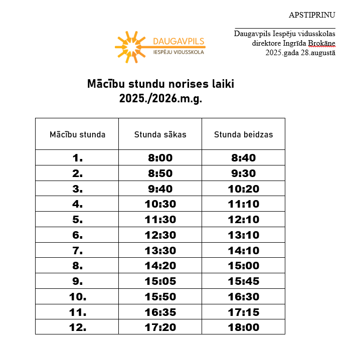 Daugavpils Iespēju vidusskolas zvanu saraksts no 01.09.2025
