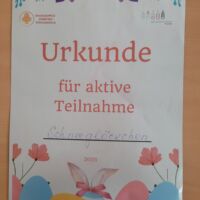 Mūsu skolu pārstāvēja 8.e un 8.f klases meiteņu komanda ar romantisku pavasara nosaukumu „Sniegpulkstenītes”. Komandām tika piedāvāti dažādi uzdevumi stacijās: izveidot jaunus vārdus no vārda „FRÜHLING”, atrast teksta informāciju par dzīvniekiem, nodziedāt dziesmu, salikt Lieldienu domino. Mūsu meitenes veiksmīgi izpildīja visus uzdevumus, viņām bija brīnišķīga iespēja izmēģināt spēkus jaunā valodā, kuru viņas tikai nesen bija sākušas apgūt kā otro svešvalodu. Mūsu skolnieces strādāja ar prieku un iedvesmu. Beigās visus gaidīja pārsteigums - lieliskas balvas no Gētes institūta.