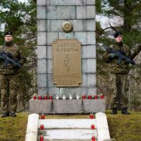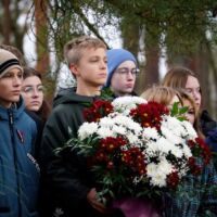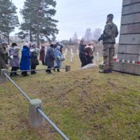 ar vēstures skolotāju Aleksandru Ignatjevu. Pie pieminekļa kritušajiem karavīriem skolēni nolika ziedus un iededzināja svecītes.
