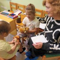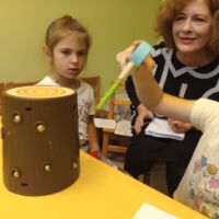 Bērni uzmanīgi klausījās un izrunāja rudens skaņas – koku lapu čaukstēšanu, vēja troksni un ar koka nūjiņām paši atdarināja lietus pilienu skaņas, praktizējot logopēdisko ritmiku. Kopā ar burvju ārstu – dzeni glāba kokus no ļaunajiem tārpiem, attīstot savas rociņas sīko pirkstu motoriku. Mazie pētnieki atcerējās, ka rudenī vajadzētu ģērbties siltāk un uz katra pirkstiņa pielaikoja krāsainās cepurītes, atceroties krāsu nosaukumus.