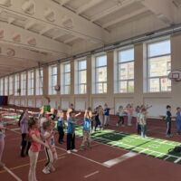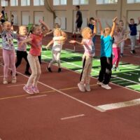 Pirmajā stacijā iesildīšanās mūzikas pavadījumā divas skolnieces jautri dejoja, un bērni atkārtoja visas rādītās kustības.