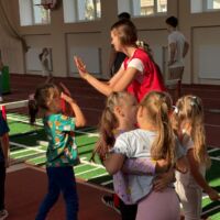 Pēc tām bērni darbojās komandās: meta bumbu grozā, nodeva viens otram stafeti, veica kūleņus ar bumbu rokās un veikli sportoja kustību aktivitātēs.