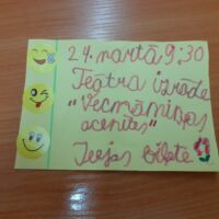 24.martā DIV pirmsskolas telpās norisinājās brīnumains pasākums – Teātra Dienai veltīta izrāde “Vecmāmiņas acenītes”. Par īstiem aktieriem kļuvuši sagatavošanas grupas “Puķītes” bērni. Mazie mākslinieki iepriecināja skatītājus ar spilgtiem deju un dziesmu numuriem, parādīja savu aktiermākslas talantu. Par centrālo figūru šajā pasakā kļuvusi galvenā varone – meitene Rozīte, kura, meklējot vecmāmiņas brilles, satiek daudz izpalīdzīgu un atsaucīgu draugu: draiskulīgu zaķēnu, čaklu skudru, radošu sienāzi, maigu pienenīti, jautru vardi, pavasarīgu lietutiņu un divus drosmīgus rūķīšus, kuri palīdz atrast pazaudētas brilles. Viss beidzās labi! Pēc izrādes noskanēja skatītāju ovācijas un aplausi, kas ir visaugstākā atzinība un balva par paveikto darbu. Izrāde sagādāja lielu prieku gan skatītājiem, gan pašiem aktieriem.