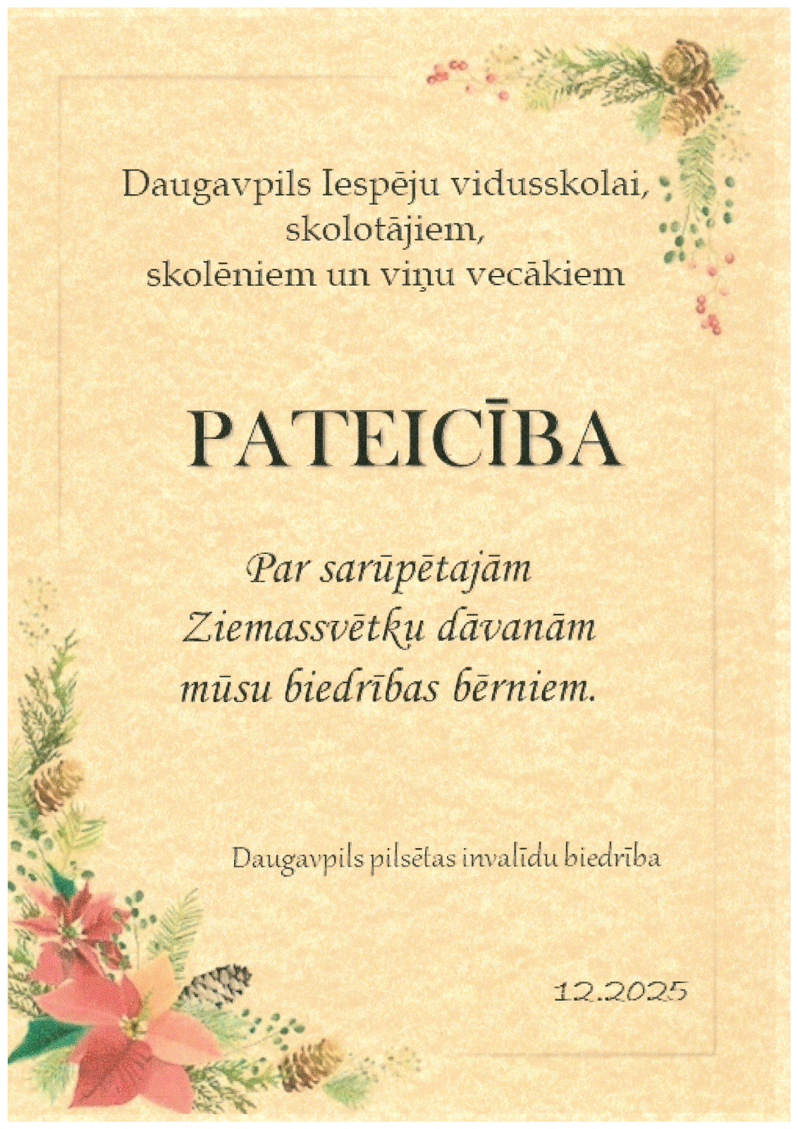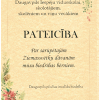 Ziemassvētku laikā, kad gaisā virmo cerība, siltums un līdzcietība, mūsu skolas saime apliecināja, ka patiesais svētku brīnums slēpjas labos darbos. Ar atvērtām sirdīm un vēlmi palīdzēt mēs iesaistījāmies Ziemassvētku labdarības akcijā, lai sniegtu atbalstu un iepriecinātu bērnus un pusaudžus ar īpašajām vajadzībām. Kopīgā darbā tika sarūpētas visdažādākās dāvanas, kas sagādāja patiesu prieku un atbalstu bērniem un pusaudžiem. Katra dāvana bija kā gaismas stariņš, kas sasildīja ne tikai tos, kuri saņēma palīdzību, bet arī pašus akcijas dalībniekus. Par sniegto atbalstu skola saņēma pateicību no pilsētas invalīdu biedrības “Ilgas”.
