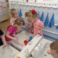 Medmāsa parādīja zobu tīrīšanas metodi. Kopā ar bērniem noskaidroja, kad jātīra zobus, kā pareizi jātur zobu birste. Rekomendēja tīrīt zobus 2-3 minūtes un izmantot smilšu pulksteņus.